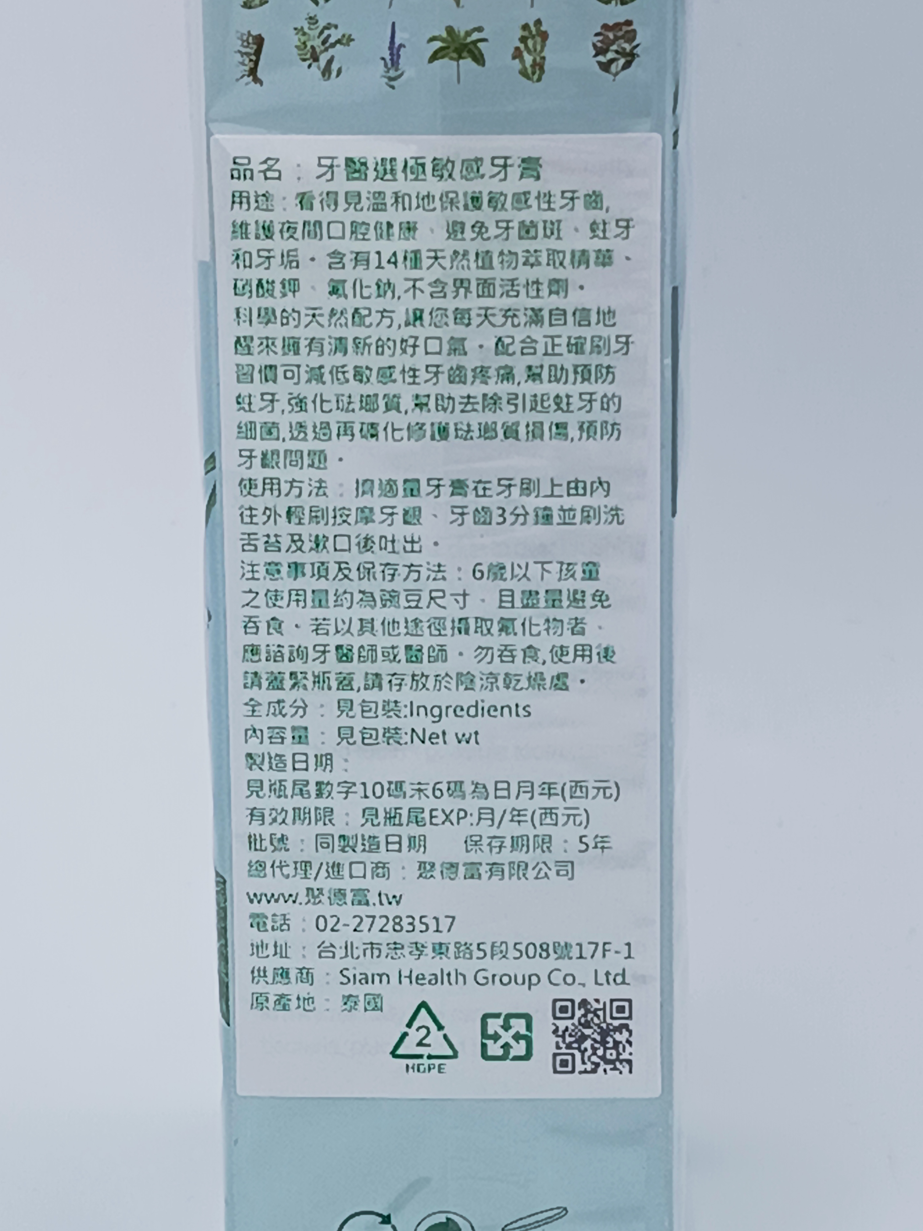 • 含有14種天然植物萃取精華、硝酸鉀、氟化鈉,不含界面活性劑。